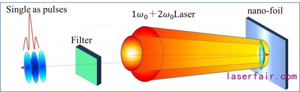 圖 1:雙色激光與納米薄靶相互作用產(chǎn)生孤立的高亮阿秒脈光的模型圖