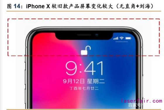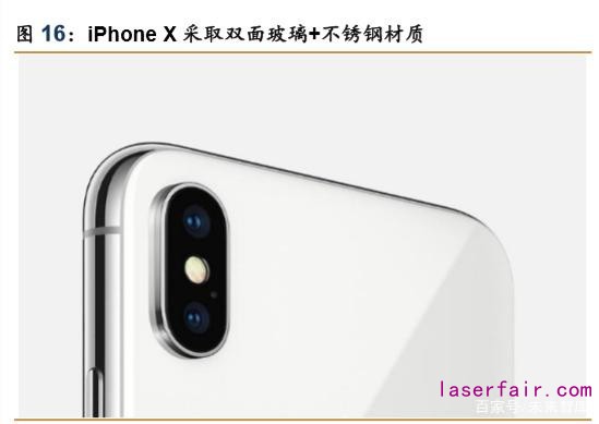 2017 年,蘋果推出新款機型 iphone X,作為 iphone 系列十周年產(chǎn)品,新款機型采取了 諸多重大創(chuàng)新,例如屏幕首次采用 OLED 材質(zhì)、取消沿用 10 年的底部 Home 鍵、后置雙攝 改為了豎向排列以及重啟雙面玻璃+不銹鋼材質(zhì)中框設(shè)計等。機身的重大革新催生了生產(chǎn)線 采用新的設(shè)備及工藝需求,其中對于新增激光加工設(shè)備需求包括: