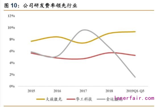 研發(fā)投入持續(xù)高位,領(lǐng)先國內(nèi)同行業(yè)企業(yè)。根據(jù)公司 2019 年三季報,公司 2019 前三 季度研發(fā)費率為 9.3%,同比+2.0pp,研發(fā)投入持續(xù)增長;橫向?qū)Ρ葋砜矗瑖鴥?nèi)激光設(shè)備行 業(yè)的華工科技同期研發(fā)費率為 5.3%、金運激光為 1.6%。