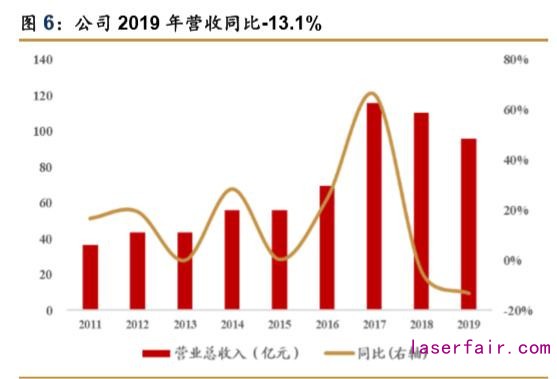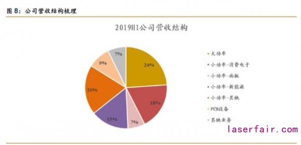 由于公司 2019 年業(yè)績快報中未披露各業(yè)務(wù)板塊具體收入,我們以 2019 半年報數(shù)據(jù)為 例對公司營收結(jié)構(gòu)進行拆分。2019H1 公司實現(xiàn)營收 47.3 億元(同比-7.3%),其中激光設(shè)備 板塊營收 39.7 億元(同比-2.7%),PCB 設(shè)備板塊營收 4.2 億元(同比-37.6%),其他業(yè)務(wù) 營收 3.4 億元(同比-2.3%)。激光設(shè)備板塊中,大功率板塊營收 11.3 億元(同比-5.4%); 小功率營收 28.4 億元,其中小功率板塊可繼續(xù)細分為:1)消費電子營收 8.8 億元(同比 -17.7%);2)面板營收 3.2 億元(同比+7.5%);3)新能源營收 7.1 億元(同比+125.2%); 4)小功率其他業(yè)務(wù)營收 9.3 億元。