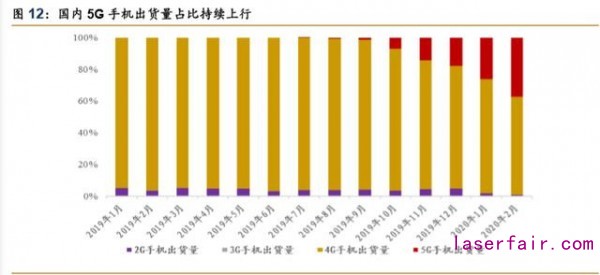 5G 手機出貨量占比持續(xù)快速提升。根據(jù)中國信通院最新數(shù)據(jù),2020 年 1-2 月,國內(nèi)手 機市場總體出貨量 2719.7 萬部,同比-44.0%;從出貨結(jié)構(gòu)來看,其中 2G 手機 38.9 萬部、 4G 手機 1896.4 萬部,5G 手機 784.5 萬部。雖然受終端消費需求疲軟影響,總體手機銷量 大幅下降,但 5G 手機銷量占比持續(xù)快速提升。2020 年 1 月 5G 手機銷量占比為 26.3%,2 月該比例提升至 37.3%。
