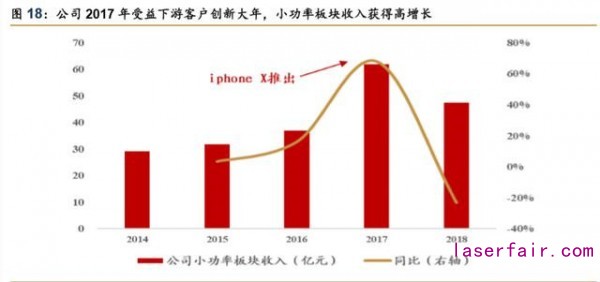 2017 年受益 A 客戶創(chuàng)新大年,公司小功率板塊取得大幅增長。公司自 2008 年獲得蘋 果認證切入其產(chǎn)業(yè)鏈,2012 年成功打入蘋果核心供應(yīng)商名單;2017 年受益客戶新品重大創(chuàng) 新帶動的產(chǎn)線設(shè)備需求斬獲大量訂單,業(yè)績?nèi)〉酶咚僭鲩L;而 2018-2019 年蘋果創(chuàng)新力度趨 緩,導(dǎo)致對產(chǎn)線設(shè)備更換需求回落,公司小功率板塊所有承壓。