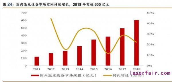國內(nèi)激光設(shè)備市場持續(xù)增長,2018 年市場規(guī)模突破 600 億元。根據(jù)《2019 中國激光產(chǎn) 業(yè)發(fā)展報告》,2018 年國內(nèi)激光設(shè)備市場規(guī)模達 605 億元,同比+22%。按下游來看,工業(yè) 加工為最大應(yīng)用市場,占比 63%(2017 年數(shù)據(jù));其次為信息市場,占比 21%(2017 年數(shù) 據(jù))。隨著未來激光器價格的降低帶動激光設(shè)備經(jīng)濟性持續(xù)改善,以及制造業(yè)對自動化產(chǎn)線 建設(shè)、替代人工的需求持續(xù)上漲,預(yù)計將推動激光設(shè)備對傳統(tǒng)工藝(機床等)進一步替代, 以及在新型應(yīng)用市場滲透率的加速提升,我們認為激光設(shè)備市場仍將保持增長態(tài)勢。