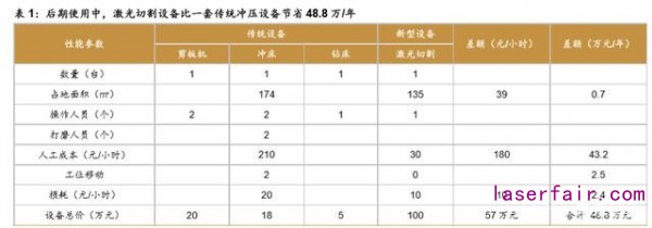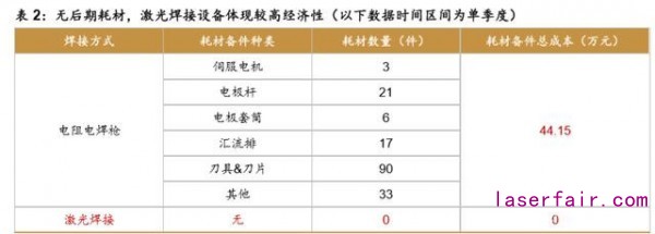 激光焊接經(jīng)濟性已經(jīng)凸顯。根據(jù)文獻《激光焊接在白車身上的應(yīng)用現(xiàn)狀》(2016 年), 北京奔馳白車身生產(chǎn)線中,傳統(tǒng)電阻電焊槍焊接方式設(shè)備初期采購成本較低,一條產(chǎn)線以 205 臺電焊槍計,每臺成本我們假設(shè)為 2000 元,則一次采購成本約 41 萬元。但傳統(tǒng)電阻焊耗材 金額較高,包括伺服電機、電極桿、電極套筒在內(nèi)的配套備件每季度消耗金額約 44 萬元(文 獻數(shù)據(jù));而激光焊接設(shè)備雖然一次采購成本較高,但后期幾乎無耗材支出。我們假設(shè)如今 一臺激光焊接設(shè)備均價為 100 萬元,每條產(chǎn)線配備 2 臺激光焊接設(shè)備,則一次采購成本為 200 萬元,相比傳統(tǒng)電阻焊高出 159 萬元。但因耗材成本的節(jié)約,激光焊接設(shè)備在 4 個季度 內(nèi)即可抹去一次采購成本差(159<44×4)。