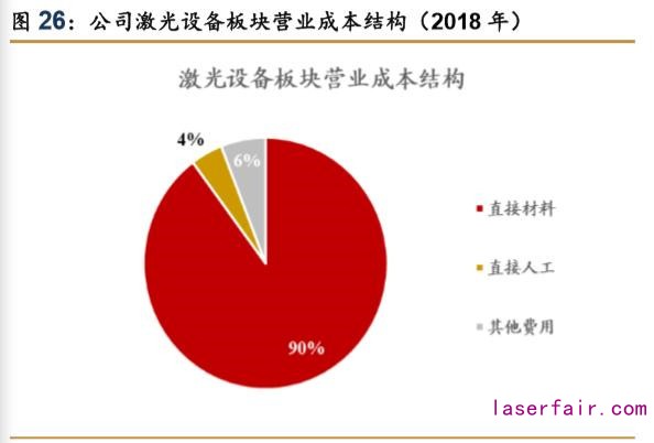 激光器為公司采購成本最高的上游元件。通過拆解公司激光設(shè)備板塊歷年成本結(jié)構(gòu),可 以看出直接材料成本占板塊營業(yè)成本約 90%。進一步拆分來看,激光器光源為最大細分項。 根據(jù)公司 2018 年發(fā)布的可轉(zhuǎn)債募集說明書中數(shù)據(jù),公司外購的原材料主要包括激光器、電 機平臺、振鏡等。以 2017H1 為例,激光器、電機平臺、振鏡分別占公司原材料采購總額的 35.8%、4.8%、2.5%;從供應(yīng)商來看,公司激光器主要采購自美國 IPG。