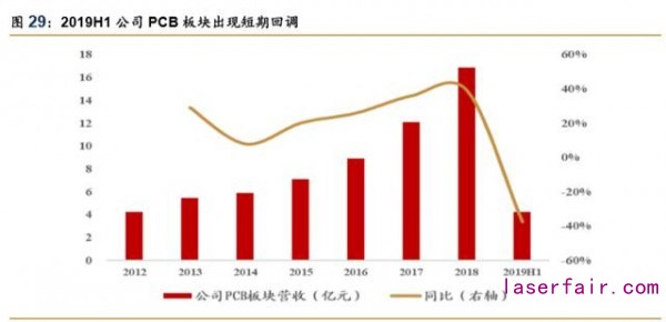 2019 年板塊營收回調(diào),2020 年有望重回高景氣。受中美貿(mào)易摩擦等因素影響,2019 年全球 PCB 產(chǎn)業(yè)出現(xiàn)短期波動。根據(jù) Prismark 于 2019 年 Q4 的預(yù)測,2019 年全球 PCB 產(chǎn)值同比-1.7%,這是自 2015 年來全球 PCB 產(chǎn)值首次出現(xiàn)同比下滑;國內(nèi)方面,2019 年國 內(nèi) PCB 產(chǎn)值預(yù)計同比+0.7%,增速明顯放緩。公司方面,受下游需求趨穩(wěn)影響,PCB 板塊 收入出現(xiàn)暫時回調(diào),2019H1 板塊營收 4.2 億元,同比-37.6%。我們認為隨著國內(nèi) 5G 建設(shè) 的持續(xù)落地,下游客戶延遲的采購訂單預(yù)計于今年迎來集中釋放期,帶動公司 PCB 板塊迎 來景氣度拐點,重返上升通道。