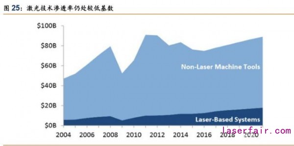 激光技術(shù)滲透率仍處低基數(shù),行業(yè)天花板遠未達到。根據(jù) IPG 公布的測算結(jié)果,目前全 球材料加工設(shè)備市場規(guī)模約 920 億美元,其中激光設(shè)備市場約 140 億美元,占比為 15%。 低滲透率基數(shù)為激光設(shè)備行業(yè)仍然保留了極大發(fā)展空間,行業(yè)天花板遠未達到。
