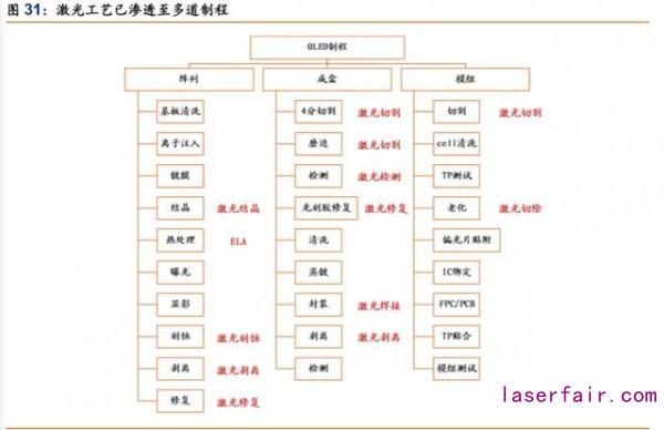 激光工藝在 OLED 生產(chǎn)中已起到至關(guān)重要的作用,目前已滲透至多道生產(chǎn)制程中,帶 來廣闊的激光設(shè)備市場。OLED 產(chǎn)線中主要涉及到的激光工藝包括: