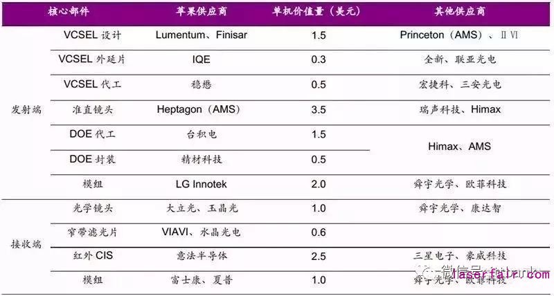 發(fā)射端的元器件大部分是創(chuàng)造了新的產(chǎn)業(yè),價(jià)值量較大,在 VCSEL 激光源、準(zhǔn)直鏡頭、DOE 光學(xué)衍射元件、模組等領(lǐng)域給相關(guān)企業(yè)帶來了巨大的全新需求。