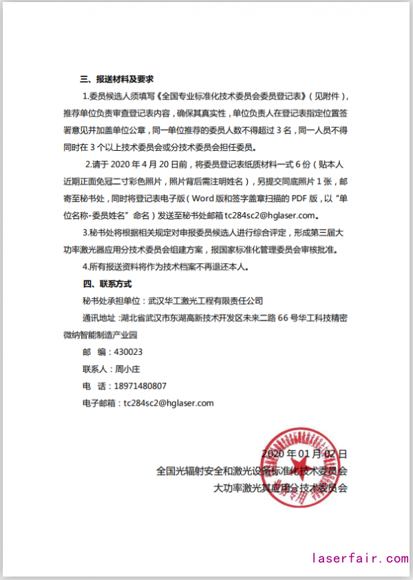 關于全國光輻射安全和激光設備標準化技術委員會大功率激光器應用分技術委員會換屆及征集委員的通知