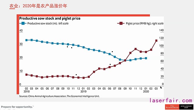 受影響最大的中國(guó)農(nóng)業(yè)部門將是家禽生產(chǎn)部門,中國(guó)養(yǎng)殖業(yè)的上下游依存度非常高,市場(chǎng)之間的產(chǎn)業(yè)鏈基本上因疫情被完全打斷。同時(shí)非洲豬瘟的風(fēng)險(xiǎn)遠(yuǎn)沒(méi)有消除。現(xiàn)在子豬的價(jià)格位于歷史上的最高點(diǎn),生豬的價(jià)格只會(huì)漲不會(huì)跌。而豬肉在中國(guó)的物價(jià)指數(shù)中占比最高。因此,《經(jīng)濟(jì)學(xué)人》智庫(kù)預(yù)計(jì),中國(guó)今年的通脹壓力或超過(guò)5%。