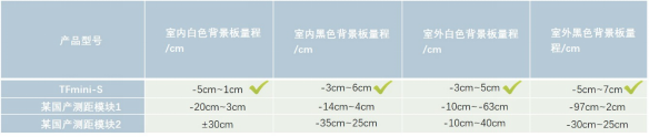 表一、TFmini-S與其他測距模塊在室內(nèi)外測距量程對比表