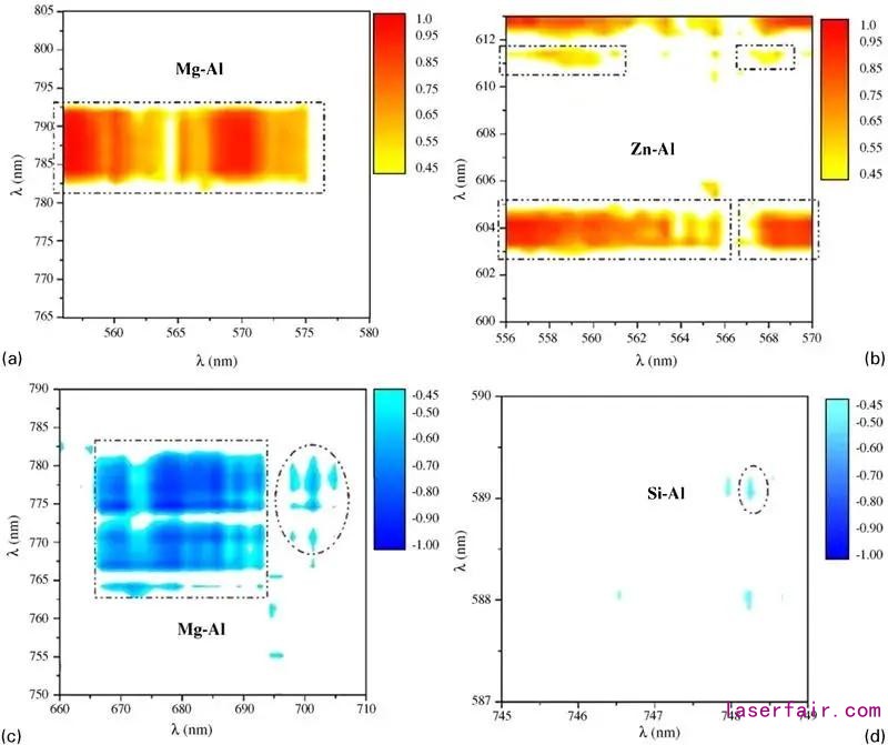在Sibillano團隊的研究方案中,采用海洋光學(xué)的低成本光譜分析儀進行缺陷探測和自適應(yīng)控制的研究?;趯庾V的相關(guān)性分析,他們研究了不同保護氣體速率的條件下的羽狀物的動力學(xué)特征,如圖4所示。圖4a和b為氣體流速為40NL每分鐘的時候,其相關(guān)性為正。然而,如圖4c和d所示,當(dāng)氣體流速為100NL每分鐘的時候,其相關(guān)性為負(fù)值。