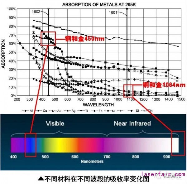 在短波波段(300-600nm區(qū)域),部分金屬的吸收率劇增(如下圖所示),特別是銅和金;處于短波波段的藍(lán)光激光(主波長(zhǎng)450nm)相比于常規(guī)9XXnm波段(9XX半導(dǎo)體激光器)、1030-1080nm波段(常規(guī)ND:YAG激光器、光纖激光器、碟片激光器)的近紅外激光,銅和金的吸收率提高了10-20倍,吸收率的大幅度提升對(duì)于銅和金的激光加工應(yīng)用具有革命性的意義。