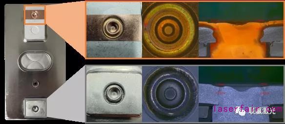 通過前期對(duì)藍(lán)光激光復(fù)合焊接在銅材的應(yīng)用開發(fā)及產(chǎn)品實(shí)際焊接的大量驗(yàn)證,實(shí)驗(yàn)結(jié)果論證了藍(lán)光激光器在銅材加工方面的積極作用,且聯(lián)贏激光專利的復(fù)合焊接技術(shù),完美地彌補(bǔ)了藍(lán)光激光器功率密度低的應(yīng)用劣勢(shì)。利用光纖激光器高功率密度的特性,能夠快速且穩(wěn)定地形成匙孔,與此同時(shí),再利用銅材對(duì)藍(lán)光的高吸收特性,使得銅材能夠快速地被加熱,以及減緩熔池的凝固速度,最大限度的減少銅材焊接中氣孔和飛濺的問題,使得無(wú)飛濺、高穩(wěn)定性、高品質(zhì)的厚銅材焊接成為可能。▲藍(lán)光復(fù)合焊接-紫銅外觀及金相圖