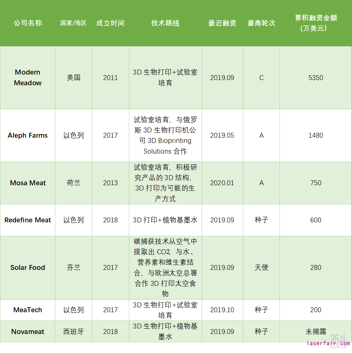 通過crunchbase數(shù)據(jù)庫與信息公開,我們列出了7家與“3D打印肉”相關(guān)的幾家公司,這些公司中有些是以3D打印技術(shù)為賣點,有些則是制造可供作3D打印肉的材料,與3D打印密切相關(guān)的程度則依公司有所差異。除了來自美國的Modern Meadow,其他公司都位于3D打印肉的重鎮(zhèn) – 歐洲,其中3家是來自以創(chuàng)新立國的以色列,西班牙、芬蘭、荷蘭則各有一家。