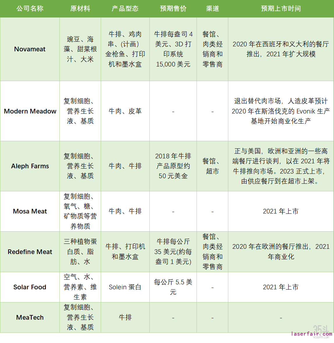 原材料方面,4家企業(yè)是從活體干細(xì)胞取材,然后進行復(fù)制和培育,2家是以植物蛋白為主,1家則是從空氣中提取出二氧化碳后,再與水、營養(yǎng)素和維生素結(jié)合制成非動物性蛋白。