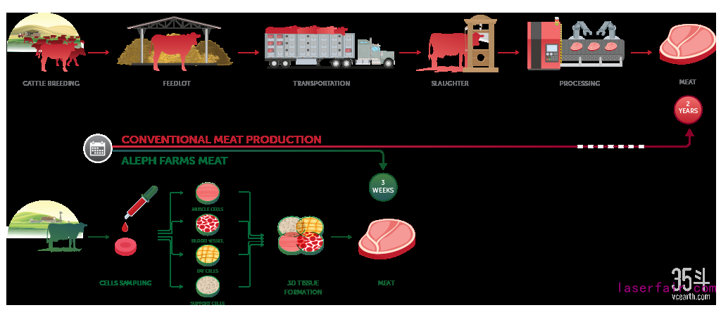 為了制作實驗室出產(chǎn)的肉,Aleph Farms首先通過小活檢從牛身上提取細(xì)胞。然后將細(xì)胞放入營養(yǎng)液中,以模擬牛體內(nèi)的環(huán)境,細(xì)胞在受控環(huán)境中長成一小塊牛排。 Aleph Farms自認(rèn)是唯一一家能夠制造包括肌肉纖維和血管在內(nèi)的全質(zhì)地肉的公司。