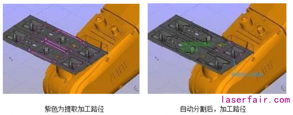 軟件可以呈現(xiàn)機器人的實時狀態(tài),因此它可以自動優(yōu)化的和完成加工路徑的分割工作。在軟件中只要選擇好工件需要加工的路徑,軟件就會根據(jù)激光一次性能夠加工的范圍,對產(chǎn)品當前姿態(tài)下可以加工的范圍進行分割。軟件自動進行計算、完成,不需要人工干預。