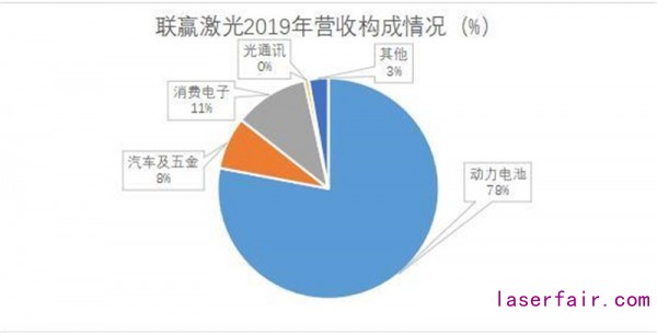 從上圖可以看出,按照應用領域來劃分的營收結(jié)構中,動力電池領域是聯(lián)贏激光主要的收入來源,2019年在該領域獲得營業(yè)額7.55億元,占營收比高達77.99%。2019年聯(lián)贏激光客戶基本涵蓋動力電池行業(yè)領先企業(yè),與裝機量前十的企業(yè)均有業(yè)務上的合作。因此,下游動力電池行業(yè)的發(fā)展情況對聯(lián)贏激光的經(jīng)營數(shù)據(jù)有較大的影響。