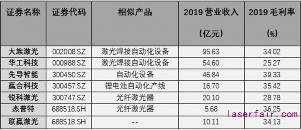 激光焊接行業(yè)屬于技術密集型行業(yè),聯(lián)贏激光是國內(nèi)少數(shù)幾家專注于激光焊接的規(guī)模型企業(yè),同行業(yè)中并沒有完全一致的可比公司,在A股中與聯(lián)贏激光有一定可比關系的上市公司如下: