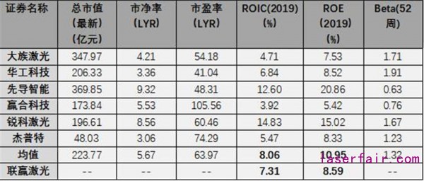 聯(lián)贏激光與可比上市公司市場定價指標對比如下: