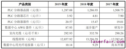 2017年-2019年,仕佳光子PLC分路器晶圓平均銷售價格分別為1508.75元/張、1286.93元/張、1287.08元/張。PLC分路器芯片平均銷售價格分別為7.90元/片、4.81元/片、3.92元/片。室內(nèi)光纜平均銷售價格分別為290.26元/芯千米、332.70元/芯千米、292.93元/芯千米。線纜材料平均銷售價格分別為12282.43元/噸、13256.29元/噸、12857.92元/噸。PLC分路器器件各期銷售單價分別為19.01元/只、15.47元/只、20.57元/只。