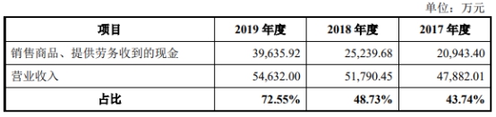 2017年-2019年,仕佳光子營業(yè)收入分別為4.79億元、5.18億元、5.46億元。銷售商品、提供勞務收到的現(xiàn)金分別為2.09億元、2.52億元、3.96億元,占營收的比例分別為43.74%、48.73%、72.55%。