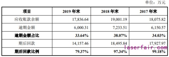 2017年末-2019年末,仕佳光子應收賬款余額分別為1.81億元、1.90億元、1.78億元,其中逾期金額分別為6150.57萬元、7233.51萬元、6000.31萬元,逾期金額占比分別為34.03%、38.07%、33.64%。期后回款金額分別為1.79億元、1.85億元、1.42億元,期后回款比例分別為99.18%、97.34%、79.37%。各期仕佳光子應收賬款凈額分別為1.71億元、1.79億元、1.68億元,占營業(yè)收入比例分別為35.71%、34.62%、30.83%。