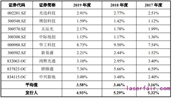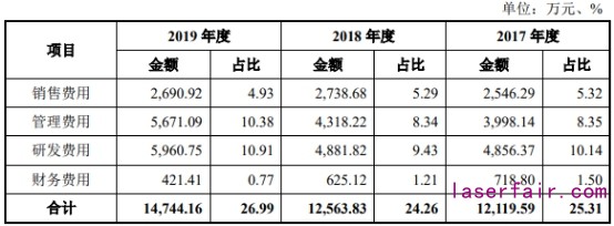 各期,仕佳光子銷售費用分別為2546.29萬元、2738.68萬元、2690.92萬元,銷售費用率分別為5.32%、5.29%、4.93%。同行銷售費用率平均值分別為3.16%、3.46%、3.58%。