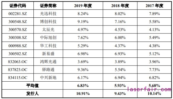 2017年、2018年和2019年,仕佳光子研發(fā)費用分別為4856.37萬元、4881.82萬元和5960.75萬元,占營業(yè)收入的比重分別為10.14%、9.43%和10.91%。同行研發(fā)費用率平均值分別為5.68%、5.93%、6.83%。