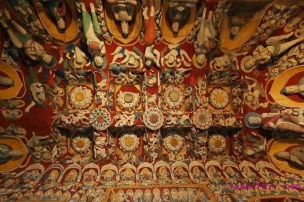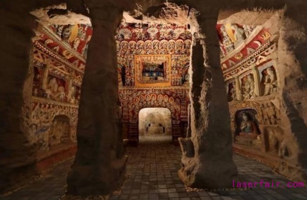 該單元是浙江大學與云岡石窟研究院戰(zhàn)略合作六年來的重要成果之一,是科技與藝術的結(jié)晶,1:1復原了云岡第12窟。云岡第12窟位于云岡石窟中部窟區(qū),因色彩華麗而成為“五華洞”的主要洞窟之一。洞窟平面呈長方形,分前后兩室,四壁布滿層層疊疊的飛天伎樂,共雕刻14種50多件樂器,是當時社會各民族樂舞藝術大融合的真實寫照。