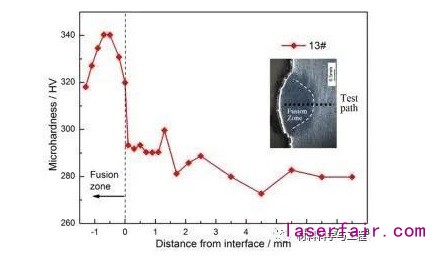 在雙相不銹鋼板上進(jìn)行多層多焊道激光熔覆,發(fā)現(xiàn)熔覆層區(qū)的條紋狀和羽毛狀的白色奧氏體緊密地分布在黑色鐵素體的內(nèi)部和邊界。熔覆層/BM界面周圍的晶粒尺寸比熔覆層上端的晶粒粗大,這是因?yàn)榭焖偌す馊鄹埠蟮睦鋮s速度以及熔覆的上端被后續(xù)熔覆進(jìn)行預(yù)熱。整個(gè)覆層的顯微硬度分布在305-360HV范圍內(nèi),平均顯微硬度約為328 HV。