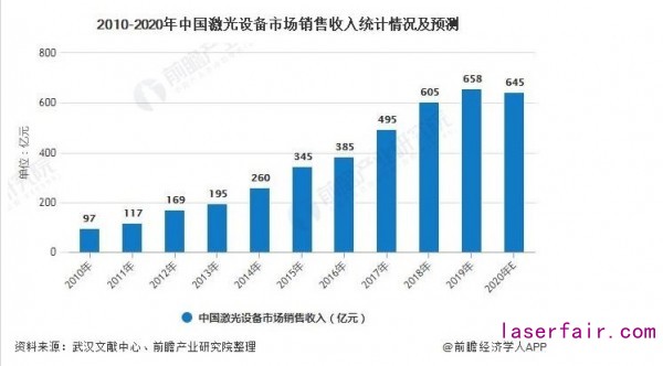 2019年激光市場(chǎng)雖然有所增長(zhǎng),但與前兩年相比增速開始放緩,全部領(lǐng)域的激光設(shè)備(含進(jìn)口)市場(chǎng)銷售收入為658億元,同比增長(zhǎng)8.8%。售全球經(jīng)濟(jì)走勢(shì)不確定的影響,預(yù)計(jì)2020年中國(guó)激光設(shè)備市場(chǎng)整體銷售收入為645億元,將出現(xiàn)近十年來(lái)首次負(fù)增長(zhǎng)。