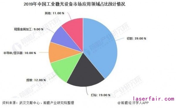 工業(yè)激光設(shè)備市場(chǎng)中,激光切割應(yīng)用最為廣泛,占比達(dá)到39%,打標(biāo)與焊接分列第二、三位,占比分別為19%、12%。