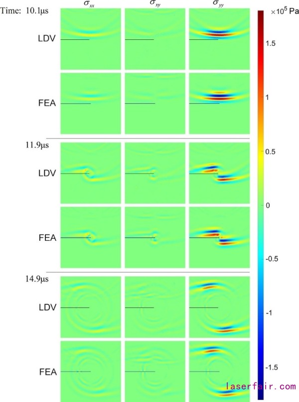 該研究用一個(gè)具有帶狀缺陷的K9光學(xué)玻璃塊進(jìn)行測試。由超聲換能器激發(fā)的縱波從玻璃塊頂端向下傳播,并被帶狀缺陷散射。LDV記錄下了各個(gè)時(shí)刻的彈性波圖像,包括三個(gè)獨(dú)立的應(yīng)力分量。有限元仿真(Finite element analysis,F(xiàn)EA)結(jié)果驗(yàn)證這種新型的測量方法。