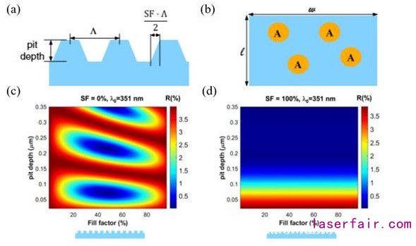根據(jù)Bruggeman’s聯(lián)合公式,研究人員設(shè)計了用于多層平面的熔融石英材料結(jié)構(gòu)(見圖1(a)和(b)),通過填充因子近似表示該層的有效折射率。填充因子指數(shù)將隨基質(zhì)和空隙體積的混合比而變化,變化率取決于特性高度?;谠摷{米幾何結(jié)構(gòu)的傳輸矩陣計算結(jié)果如圖1(c)和1(d)所示。通過控制納米結(jié)構(gòu)特征高度和側(cè)壁傾斜度,可以設(shè)計具有指定特征波段的抗反射結(jié)構(gòu)。