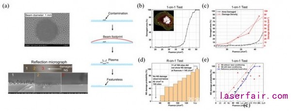 圖2 樣品激光損失實驗結(jié)果:(a)納米結(jié)構(gòu)表面損傷形貌SEM表征;(b)和(c)351nm激光損傷試驗結(jié)果;(d)和(e)1053nm激光損傷試驗結(jié)果。