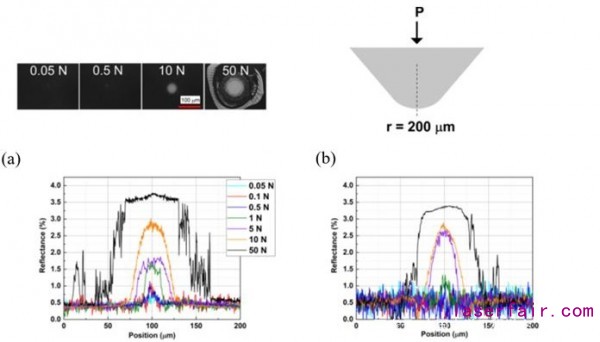 圖3 納米結(jié)構(gòu)靜態(tài)魯棒性實驗結(jié)果:使用半徑為200μm的標(biāo)準(zhǔn)尖端加載(a)351nm結(jié)構(gòu)和(b)1053nm結(jié)構(gòu),負載范圍為50 mN至50 N。