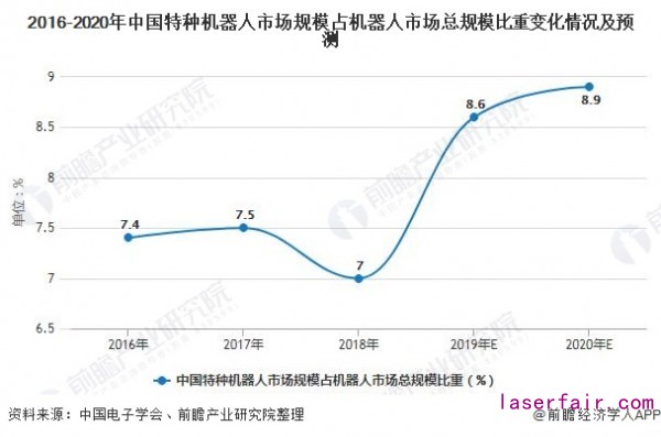 2016-2020年中國特種機(jī)器人市場(chǎng)規(guī)模占機(jī)器人市場(chǎng)總規(guī)模比重變化情況及預(yù)測(cè)
