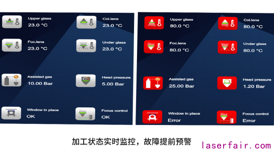 鏡片溫度、焦點位置、壓力控制、鏡片位置等實時監(jiān)控,故障提前預(yù)警,穩(wěn)定護航切割作業(yè)。