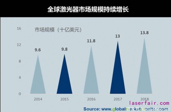 激光產(chǎn)業(yè)鏈中游為激光器,包括光纖激光器、二氧化碳激光器、其他固體激光器等。激光器作為所有激光應(yīng)用產(chǎn)品的核心部件,是所有激光應(yīng)用產(chǎn)品的重中之重,下游設(shè)備市場規(guī)模的高速增長也帶動激光器市場需求不斷上升。2018年中國激光器市場規(guī)模達11.8億美元,占全球市場份額的60.6%。