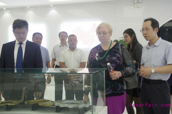步入邦德激光現(xiàn)代化多功能展廳,大使及代表團立刻對切割精美的展品表現(xiàn)出濃厚興趣,頻頻駐足細看。