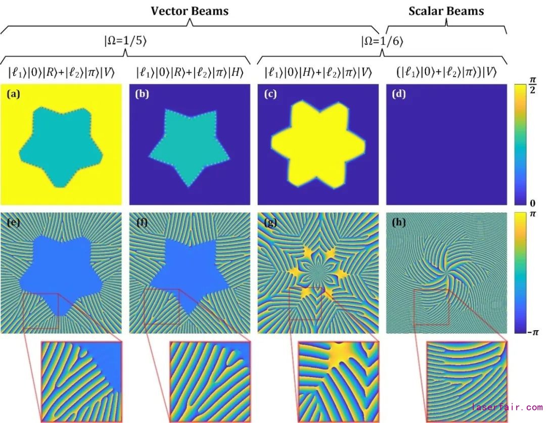 傳統(tǒng)矢量渦旋光束具有圓柱對(duì)稱性結(jié)構(gòu),是SAM偏振和OAM模式的糾纏疊加態(tài),而表現(xiàn)為空間角向變化的偏振分布形態(tài),其表征不會(huì)逃出這SAM-OAM雙自由度糾纏態(tài)限制。而本文提出的一種全新的矢量渦旋光,具有更豐富的二維旋轉(zhuǎn)對(duì)稱性結(jié)構(gòu),是傳統(tǒng)圓柱對(duì)稱結(jié)構(gòu)的廣義拓展,同時(shí)具備多重可操控自由度,除了包括傳統(tǒng)的OAM模式和偏振,還拓展了新的自由度如軌跡簡(jiǎn)并度,軌跡相位,軌跡組合數(shù)等,首次實(shí)現(xiàn)矢量渦旋光的超自由度特性,實(shí)現(xiàn)了對(duì)應(yīng)多自由度多粒子糾纏態(tài)的經(jīng)典模式。