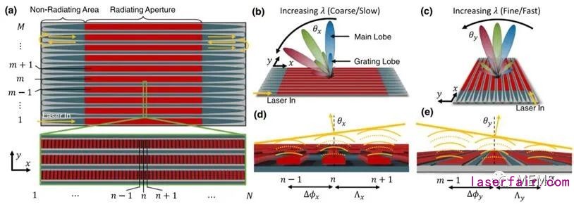 操縱2D波長(zhǎng)的單個(gè)SOPA瓦片示意圖。(a)單個(gè)SOPA瓦片拓?fù)涫疽鈭D;M行光柵波導(dǎo)陣列(紅色)呈蛇形排布,與反激(藍(lán)色)串行連接。每行有N個(gè)光柵周期。(b)對(duì)光束的粗略(慢)操縱。(c)對(duì)光束的精細(xì)(快)操縱。(d)沿θx的粗略操縱,每個(gè)光柵波導(dǎo)將光衍射到與波長(zhǎng)相關(guān)的齒到齒相位延遲決定的角。(e)沿θy方向的精細(xì)微調(diào),光柵陣列將光衍射到與波長(zhǎng)相關(guān)的行到行相位延遲決定的角度。