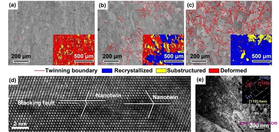 圖5 SLM打印FeCoCrNi高熵合金在(a) 1173K, (b) 1373K, and (c) 1573K下2h退火后的孿晶分布同圖,右上角圖像為再結(jié)晶分布圖;(d)SLM打印CoCrFeMnNi高熵合金的納米孿晶HRTEM圖;(e)SLM打印FeMnCoCrC0.5高熵合金在12%應變下納米納米雙hcp片層復合結(jié)構(gòu).