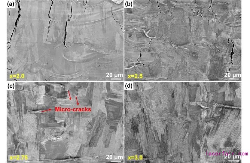 圖3 不同Ni元素含量對SLM成型AlCrCuFeNix裂紋的影響: (a) x?=?2.0(明顯裂紋); (b) x?=?2.5; (c) x?=?2.75; (d) x?=?3.0(幾乎無裂紋)