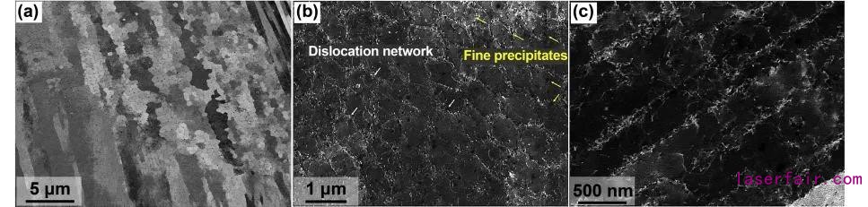 由于SLM工藝具有復雜的熱循環(huán)和極高的冷卻速率(106K/s),其制備的HEA晶粒的尺寸低至幾微米,且可以產(chǎn)生很高密度的位錯、亞晶界、納米孿晶等,如圖4所示,這將極大提升HEA機械性能。另一個顯著特點是SLM打印的HEA更容易產(chǎn)生析出相。傳統(tǒng)工藝制造的HEA需要較長時間的熱處理來產(chǎn)生析出相,而SLM打印HEA晶格的多界面或多缺陷特征為析出相提供了理想的生長載體,只需較短時間的熱處理或不熱處理即可得到析出相。合金成分對于性能的影響至關重要。此外,對SLM打印的HEA進行后續(xù)熱處理,還可以產(chǎn)生孿晶(如圖5所示)等微觀結(jié)構(gòu)。