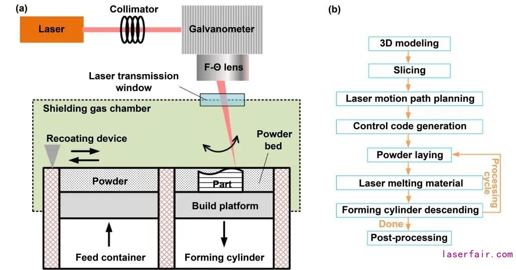 圖1(a)SLM工藝的原理圖解;(b)SLM的處理過程