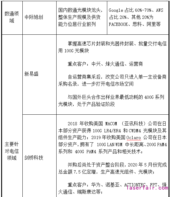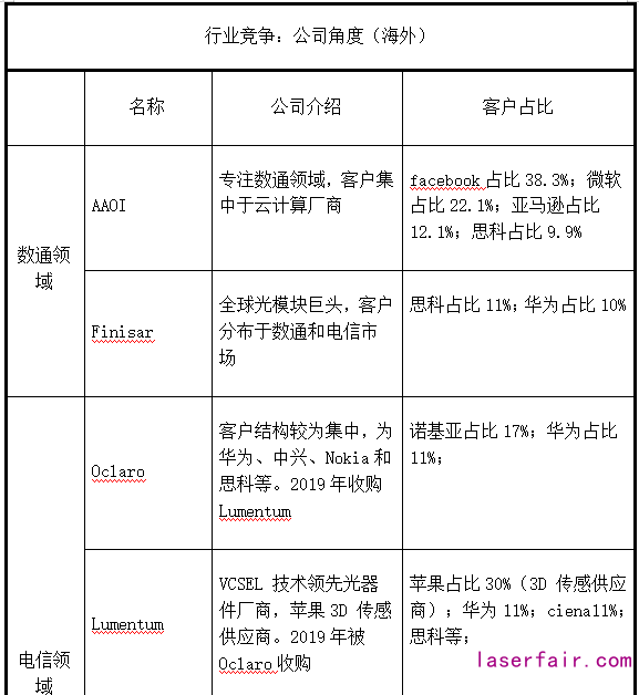 從細(xì)分領(lǐng)域數(shù)通市場看,根據(jù)2019年全球光模塊市場銷售情況及對(duì)光模塊公司下游客戶的分析,目前國內(nèi)外數(shù)通領(lǐng)域(應(yīng)用于IDC)具備高速光模塊供貨能力企業(yè)有中際旭創(chuàng)(300308)、海外AAOI(應(yīng)用光電)和Finisar(菲尼薩)。